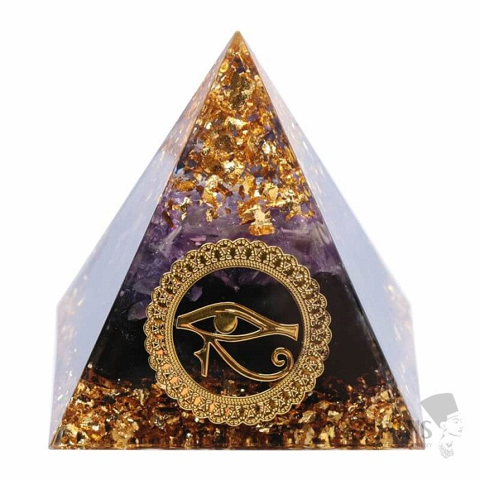 Beautiful orgonite in the form of a Horus eye pyramid with pieces of natural amethyst and obsidian . The pyramid has been a symbol of eternity and protection for centuries. Since ancient Egypt, people have believed that the pyramid is a symbol that aids strength and power, provides energy and brings passion for life. In addition to the fact that the pyramid is traditionally said to have a positive effect on its surroundings and to suppress electromagnetic radiation, this attractive pyramid is also a beautiful home decoration. Dimensions: approx. 5 x 5 x 5 cm. Illustrative image, each orgonite is unique.