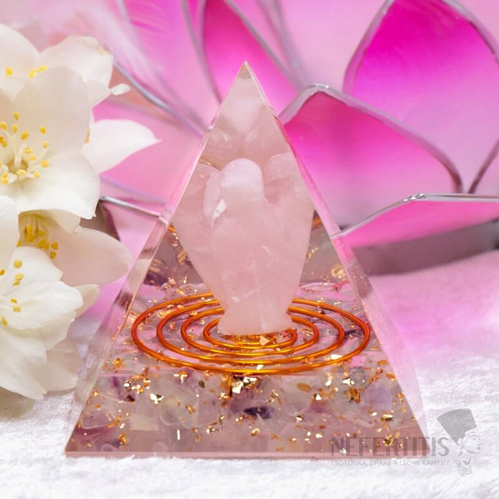 Enchanting Orgonite Guardian Angel made of rose quartz in fluorite in the form of a pyramid. The angel is a powerful symbol that expresses happiness and protection from everything bad in life, it is a symbol of hope, enlightenment and guidance along the right path in life. In the orgonite there is a copper spiral to increase the positive energy in the space in which the pyramid is placed. Illustrative image, each piece is unique.