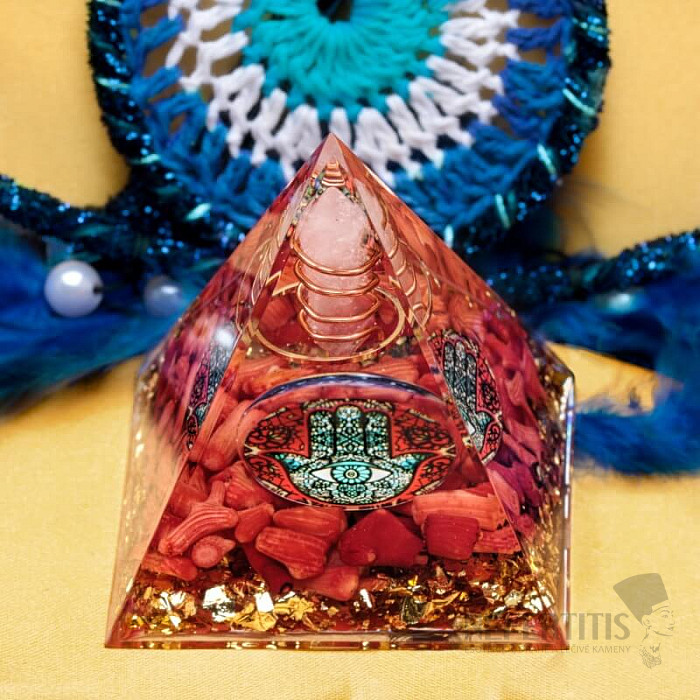 Charming orgonite Hamsa in the form of a pyramid with a crystal of natural crystal and with a copper spiral traditionally to increase the positive energy in the space where this orgonite pyramid is placed. Hamsa is a symbol for luck, health and success. The evil eye shown in the hand protects against evil forces. A crystal of natural crystal , located at the tip of the pyramid, is generally considered to be a "radiator" that is said to support not only effects of orgonite. In the pyramid, there are pieces of colored quartz that look like red coral. Dimensions: approx. 6 x 6 x 6.2 cm (base, height). Illustrative image.