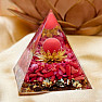 Charming orgonite Lotus flower in the form of a pyramid. In the pyramid are polished pieces resembling red coral and a lotus flower made of base metal. Dimensions: approx. 6 x 6 x 6.2 cm (base, height). Illustrative image.