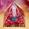 Charming orgonite Hamsa in the form of a pyramid with a crystal of natural crystal and with a copper spiral traditionally to increase the positive energy in the space where this orgonite pyramid is placed. Hamsa is an ancient symbol, which is supposed to protect against bewitchment. A crystal of natural crystal , located at the tip of the pyramid, is generally considered to be a "radiator" that is said to support not only effects of orgonite. There are pieces of colored quartz in the pyramid. Dimensions: approx. 5 x 5 x 5.5 cm (base, height). Illustrative image.