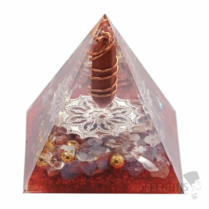 Charming orgonite with red jasper in the form of a pyramid. In the pyramid is a jasper crystal in a copper spiral, which is traditionally used to increase the positive energy in the space where this orgonite pyramid is located. There are polished pieces and a red jasper crystal in the pyramid. Dimensions: approx. 6 x 6 x 6.2 cm (base, height). Illustrative image, each orgonite is unique.