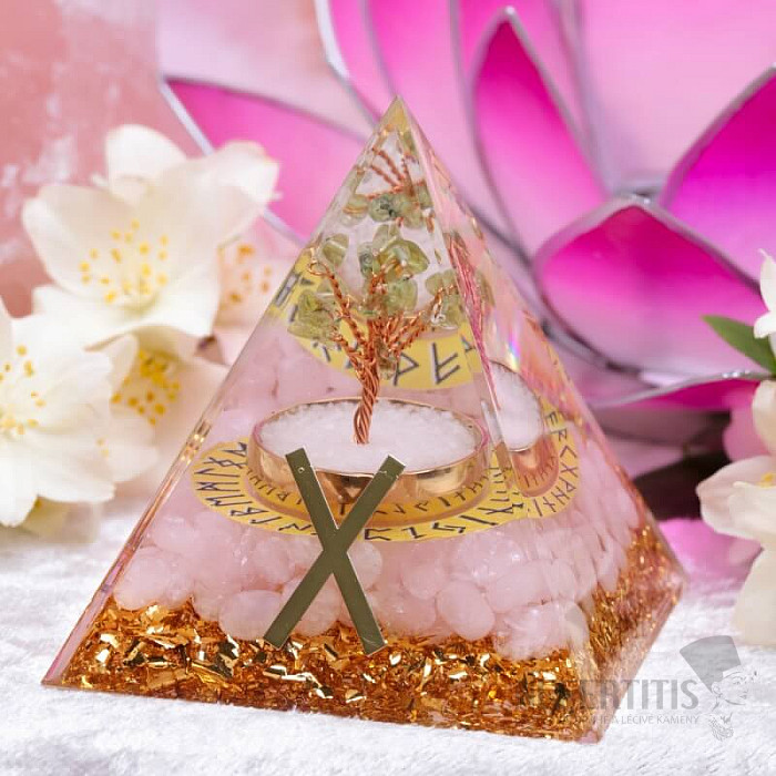 A beautiful orgonite in the shape of a pyramid of Runa Gebo with pieces of rose quartz and a tree of life made of olivine. The pyramid has been a symbol of eternity and protection for centuries. Since ancient Egypt, people have believed that the pyramid is a symbol that aids strength and power, provides energy and brings passion for life. In addition to the fact that the pyramid is traditionally said to have a positive effect on its surroundings and to suppress electromagnetic radiation, this attractive pyramid is also a beautiful home decoration. Dimensions: approx. 6 x 6 x 6.2 cm. Illustrative image, each orgonite is unique.