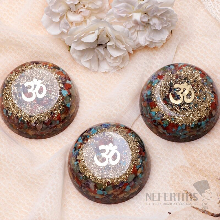 A beautiful orgonite in the form of a hemisphere with a flat top for harmonizing the chakras with colored pieces of seven types of semi-precious stones for positive energy in the space where this orgonite hemisphere is placed. Seven types of semi-precious stones in the colors of all chakras harmonize and recharge the energy of the chakras, body and mind. A fine relief with the syllable Om, golden colored, is ground into the surface of the orgonite, so that the orgonite gives its owner additional inner spiritual strength, of which Om is the symbol. Orgonite in this shape is ideal as a paperweight, it is also suitable for placing in the refrigerator, where orgonite vitalizes food and supports the maintenance of its nutritional value. This form of orgonite is also used for flowers, whether in the house or in the garden, where it gives the plants vitality and more lush growth. Thanks to its hemispherical shape and size of almost 7 cm, it is an orgonite with a long range , it purifies its surroundings up to a distance of about 5 meters. It brings strength and power, promotes good health, provides physical energy and brings passion for life. In addition to having a positive effect on its surroundings and neutralizing electromagnetic radiation, this attractive hemisphere is also a beautiful home decoration. Orgonite size approx. 6.7 cm, height approx. 3 cm.