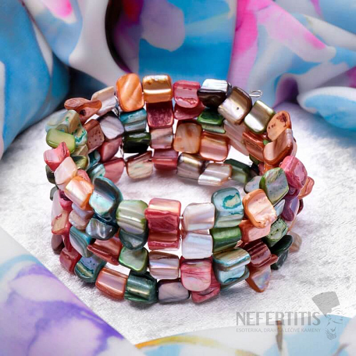 Attractive four-row Multicolor bracelet made of colored pieces of mother-of-pearl, a talisman of endless love and new beginnings. Pieces of mother-of-pearl are strung on wires. Bracelet width approx. 3.5 cm. Material: colored mother of pearl, steel memory wires. Illustrative depiction of natural material, where the color, size and structure of the pearl may differ from the accompanying photos. However, you will always receive a bracelet of comparable quality.