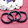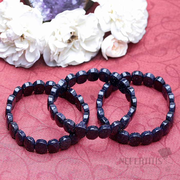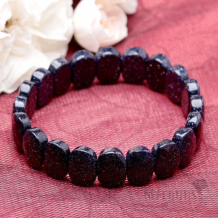 A distinctive, beautiful bracelet made of oval-shaped plates of cut sparkling blue aventurine. The faceted cut edges on these stones give the bracelet a sparkling, exclusive look. The width of the bracelet is approx. 14 mm, the ovals of blue aventurine are strung on two blue nylon rubber bands. Illustrative image.
