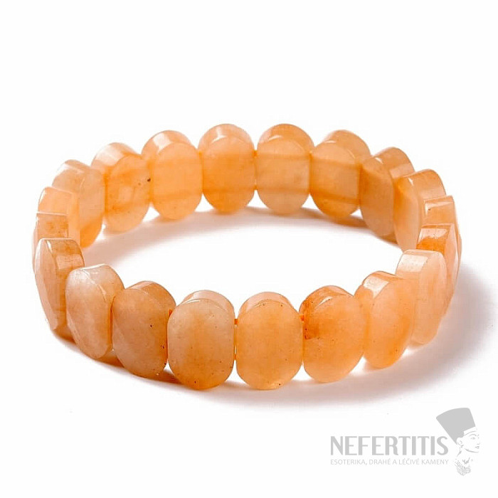 A distinctive, beautiful bracelet made of oval-shaped plates of cut red aventurine. The faceted cut edges on these stones give the bracelet a sparkling, exclusive look. The width of the bracelet is approx. 14 mm, the aventurine ovals are strung on two orange nylon rubber bands. Illustrative image, you are buying a natural material, therefore individual bracelets may differ from the accompanying photos in terms of size, shape, color, structure and pattern of stones.