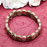 A distinctive, beautiful bracelet made of oval-shaped plates of cut unakite. The faceted cut edges on these stones give the bracelet a sparkling, exclusive look. The width of the bracelet is approx. 14 mm, the unakite ovals are strung on two green nylon rubber bands. Illustrative image, you are buying a natural material, therefore individual bracelets may differ from the accompanying photos in terms of size, shape, color, structure and pattern of stones.