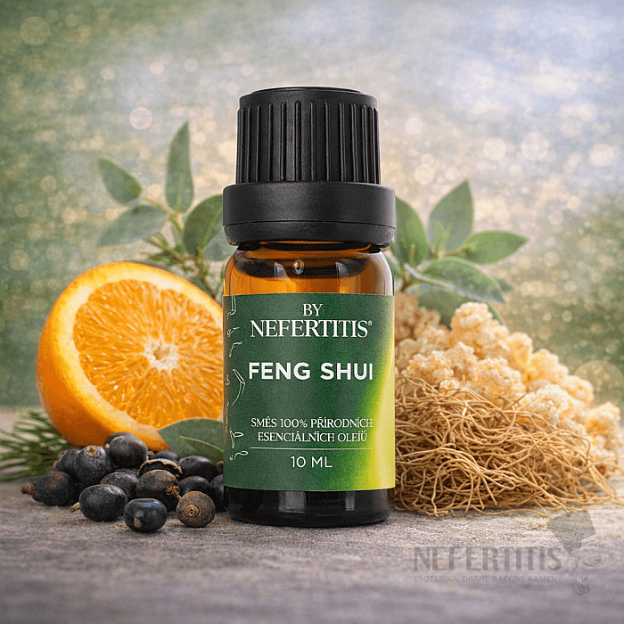 The aromatherapy blend of 100% natural essential oils By Nefertitis Feng shui is a balanced, fresh-resinous composition created to support the flow of energy in the space and within ourselves. It combines sweet orange with the cleansing power of frankincense, the freshness of eucalyptus, the woody purity of juniper and the deep grounding of vetiver.