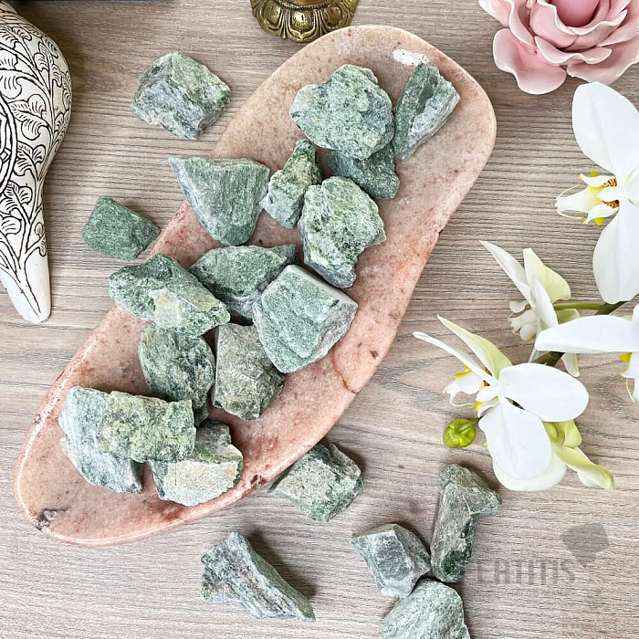 Illustrative depiction of natural material, where the color and structure of the stone may differ from the accompanying photos. However, you will always receive raw diopside of comparable quality.
