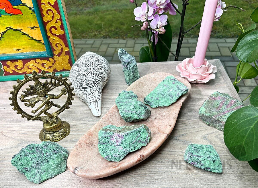 Illustrative depiction of natural material, where the color and structure of the stone may differ from the accompanying photos. However, you will always receive a raw ruby in zoisite of comparable quality.