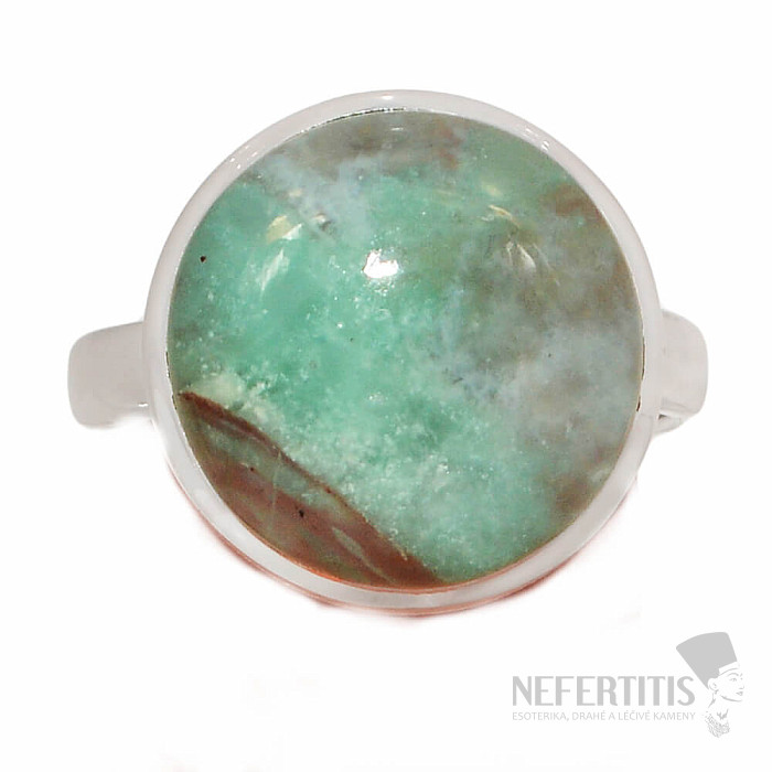 Beautiful silver ring made of rare aquaprase. Ag 925. Aquaprase is a beautiful variety of chalcedony, originating from Africa, combining blue-green and brown. Thanks to the unusual combination of colors, sky blue combined with green and brown, each piece is unique, some may contain milky white inclusions resembling sea waves, or islands floating in the sea, or clouds in the sky. Thanks to its appearance, the stone is unusually beautiful and unmistakable. The size of the stone is approximately 1.6 cm . You are buying the jewelry pictured.