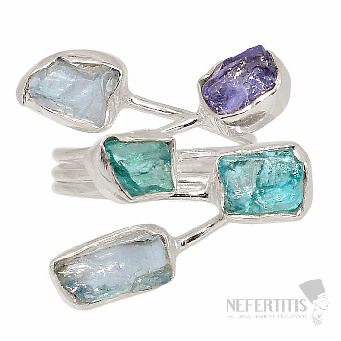 Silver designer ring with raw tanzanite, apatites and aquamarines. Ag 925. This ring is particularly beautiful not only in its shape, but above all in its workmanship. The size of the part with stones is approximately 2.2 cm . You are buying the jewelry shown directly.