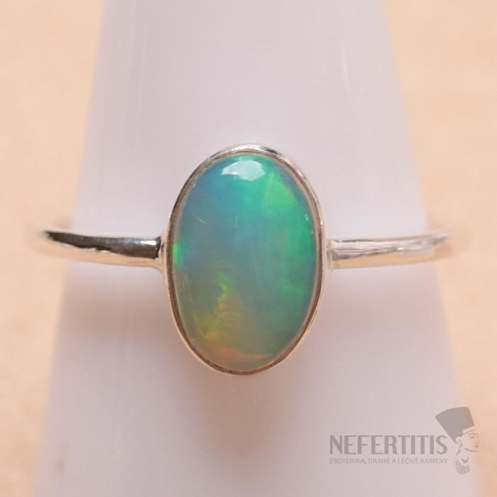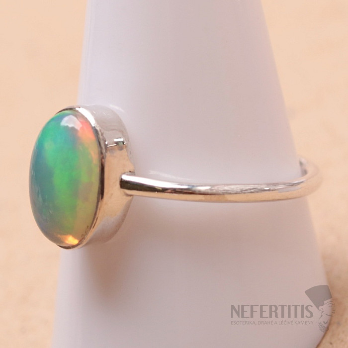 Elegant silver ring with a cabochon of Ethiopian opal. Ag 925. Impressive and elegant jewelry, evoking joy and feelings of harmony from the look. Ethiopian opals, compared to Australian opals, literally luxuriate in neon-bright reflections of colors. Although they don't look like it at first glance, the fireworks of colors that burst from the opal in this pendant with every light hit will enchant not only you, but all your surroundings. Stone size approx. 1.1 cm. You are buying the jewelry pictured.