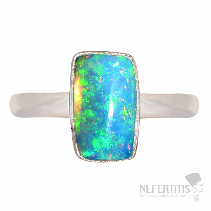 Elegant silver ring with a cabochon of Ethiopian opal. Ag 925. Impressive and elegant jewelry, evoking joy and feelings of harmony from the look. Ethiopian opals, compared to Australian opals, literally luxuriate in neon-bright reflections of colors. Although they don't look like it at first glance, the fireworks of colors that burst from the opal in this pendant with every light hit will enchant not only you, but all your surroundings. Stone size approx. 0.9 cm. You are buying the jewelry pictured.