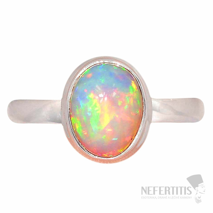 Elegant silver ring with a cabochon of Ethiopian opal. Ag 925. Impressive and elegant jewelry, evoking joy and feelings of harmony from the look. Ethiopian opals, compared to Australian opals, literally luxuriate in neon-bright reflections of colors. Although they don't look like it at first glance, the fireworks of colors that burst from the opal in this pendant with every light hit will enchant not only you, but all your surroundings. Stone size approx. 0.9 cm. You are buying the jewelry pictured.