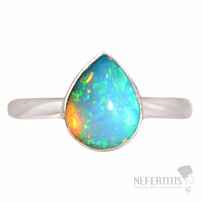 Elegant silver ring with a cabochon of Ethiopian opal. Ag 925. Impressive and elegant jewelry, evoking joy and feelings of harmony from the look. Ethiopian opals, compared to Australian opals, literally luxuriate in neon-bright reflections of colors. Although they don't look like it at first glance, the fireworks of colors that burst from the opal in this pendant with every light hit will enchant not only you, but all your surroundings. Stone size approx. 0.9 cm. You are buying the jewelry pictured.