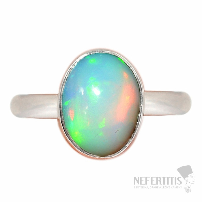 Elegant silver ring with a cabochon of Ethiopian opal. Ag 925. Impressive and elegant jewelry, evoking joy and feelings of harmony from the look. Ethiopian opals, compared to Australian opals, literally luxuriate in neon-bright reflections of colors. Although they don't look like it at first glance, the fireworks of colors that burst from the opal in this pendant with every light hit will enchant not only you, but all your surroundings. Stone size approx. 0.9 cm. You are buying the jewelry pictured.