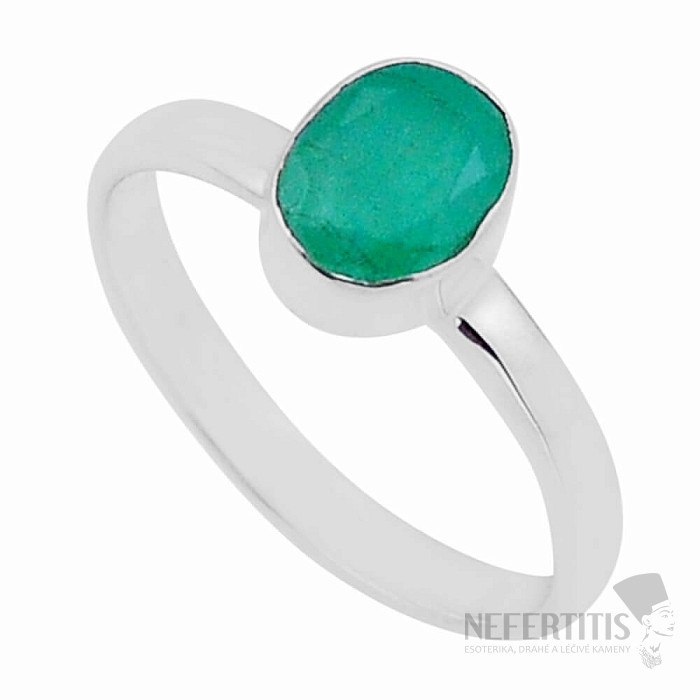 Elegant and distinctive silver ring with a cut Indian emerald. Ag 925. Indian emerald is a trade name for a natural stone, most often sillimanite or corundum, artificially dyed to the color of emerald. It is therefore not a natural emerald. The size of the stone is approximately 0.7 cm. You are purchasing the jewelry shown directly.
