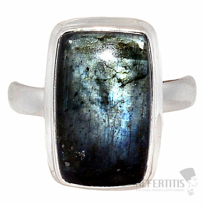 Beautiful and unique silver ring with natural larvikite, whose shimmer is reminiscent of stars in the night sky. This stone is also called black moonstone or black labradorite, due to the rainbow play of colors under the falling light. Ag 925. Let yourself be enchanted by the beauty and play of its vibrant colors reminiscent of moonstone and the starry sky. Stone size approx. 1.7 cm. You are purchasing the jewelry pictured.