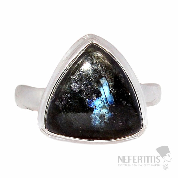 Beautiful and unique silver ring with natural larvikite, whose shimmer is reminiscent of stars in the night sky. This stone is also called black moonstone or black labradorite, due to the rainbow play of colors under the falling light. Ag 925. Let yourself be enchanted by the beauty and play of its vibrant colors reminiscent of moonstone and the starry sky. Stone size approx. 1.3 cm. You are purchasing the jewelry pictured.
