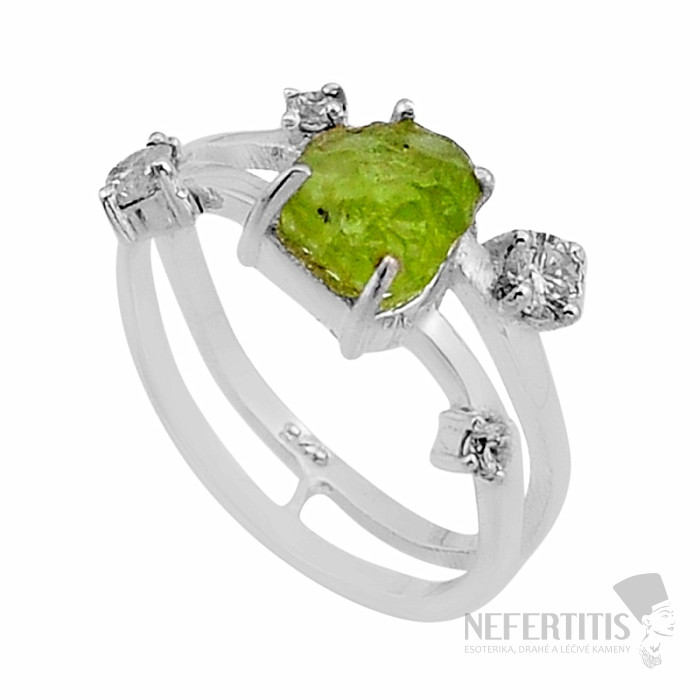 Silver ring with raw olivine and zircons. Ag 925. Olivine size approx. 0.7 cm. You are purchasing the jewelry pictured.