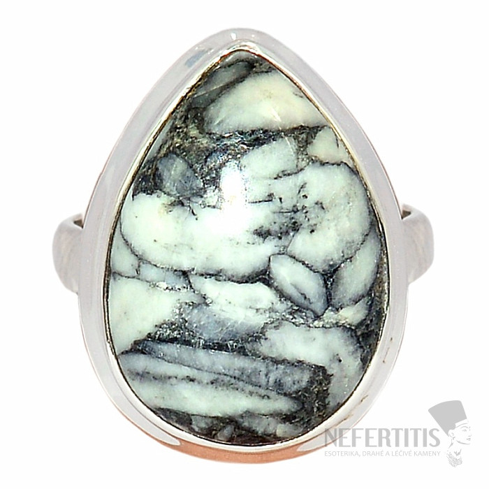 Silver ring with a decorative rare pinolite set in a silver frame. Ag 925. Pinolite is a graphite-pigmented, light gray to almost black dolomite with inclusions of white magnesite grains that resemble pine seeds, which is where the name pinolite is derived from, as pine in Latin is "pinus". The size of the stone is approximately 2 cm. You are purchasing the jewelry pictured.
