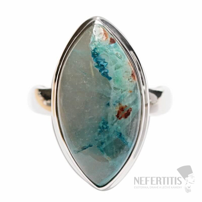Charming silver ring with rare and collector-valued natural Quantum quattro. Ag 925. Quantum quattro is a combination of four minerals - shattuckite, dioptase, malachite and chrysocolla. Each piece of jewelry is original, unique and thanks to the color combination and arrangement of minerals, it stimulates the imagination, reminiscent of a bird's eye view of the Earth. You will have a beautiful piece of jewelry that no one will miss, suitable for various occasions. You are buying the jewelry shown directly. Stone size approx. 2.3 cm.