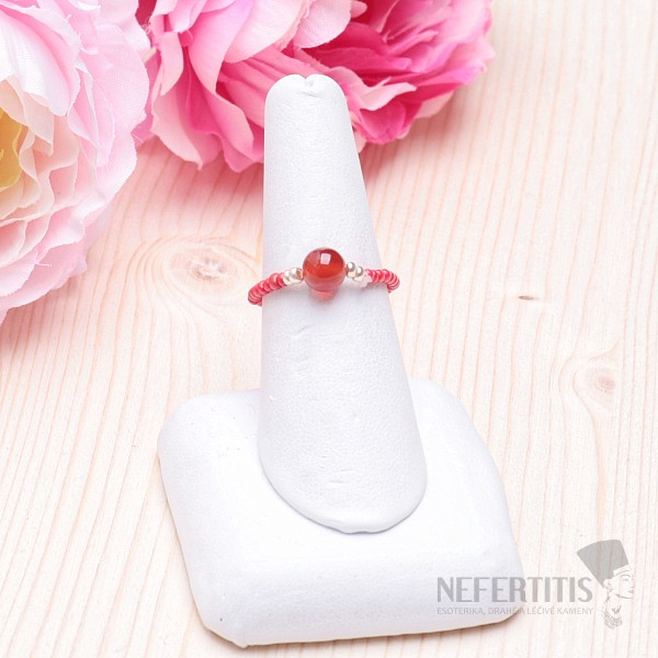 Elastic ring with carnelian, with glass seed beads, so - called seed. The ring is elastic, size approx. 56 mm (US 8) stretchable up to 61 mm (US 10.5). Metal beads are made of base metal. Illustrative depiction of the accessory material, color, shape and size of the stones may differ from the accompanying photographs.