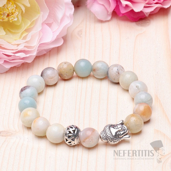 A bracelet made of large amazon beads, with a metal Buddha head and a bead in the Tibetan style. Amazonite beads approx. 10 mm and metal beads made of base metal are strung on a high-quality white nylon rubber band. lustrative depiction of natural material, where the color and structure of the stone may differ from the accompanying photographs. However, you will always receive a bracelet of comparable quality.
