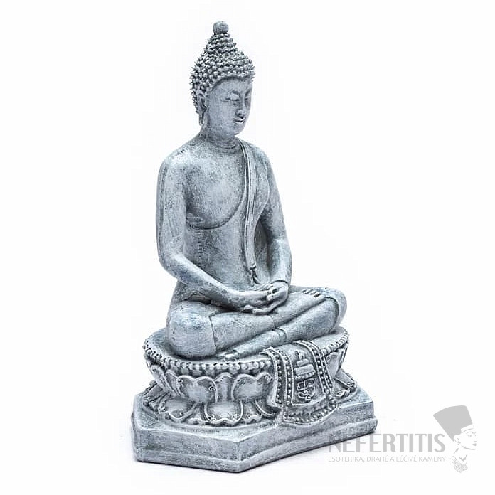 Beautiful large Thai statuette of a meditating Buddha in gray. Symbolism: the meditating Buddha expresses concentration and stability. Weight is about 1570 g, height 39 cm. The statuette is made of durable polyresin.