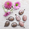 An unusual, beautiful expressive pendant with a large oval cabochon of natural rhodonite in the shape of a large oval in a beautifully crafted decorative silver frame made of jewelery metal. This is a very high quality… more »
