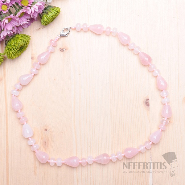 A beautiful, delicate necklace made of polished beads in the shape of drops and rosary rondels. Rosary is a symbol of love and beauty. Necklace length approx. 45 cm, drop length approx. 1.4 cm, jewelry clasp. Illustrative image, you are buying a natural product, therefore individual necklaces may differ from it mainly in color shade, luster and stone pattern. However, you will always receive a necklace of comparable quality.