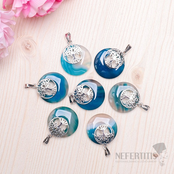 Attractive pendant made of blue agate with the Tree of Life, with a handle made of base metal. The diameter of the stone is about 2.7 cm, the diameter of the tree of life is about 1.7 cm, the total length of the pendant, including the hanging eye, is about 3 cm, The tree of life is made of base metal. An unmissable and cute piece of jewelry that will enchant everyone. Illustrative depiction , individual pendants differ significantly from it, especially in color, structure and drawing of the stone.