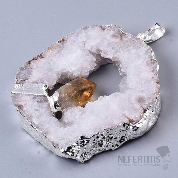Plated druse agate pendant with citrine crystal . Handle made of silver-colored jewelry metal. The size of the drusen is approx. 4 - 5 cm, the total length of the pendant is approx. 4.8 - 5.8 cm. Illustrative representation of a natural product, the pendants may differ in color, structure and design from the accompanying photos, but you will always receive a pendant of comparable quality.