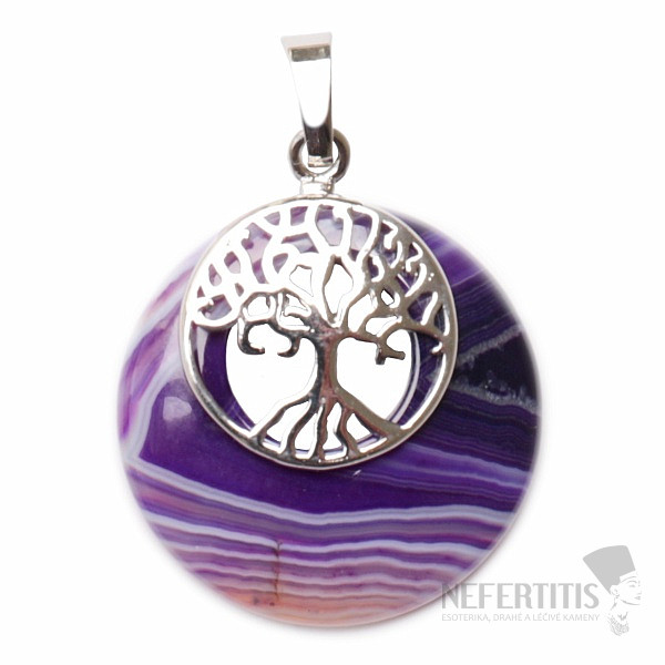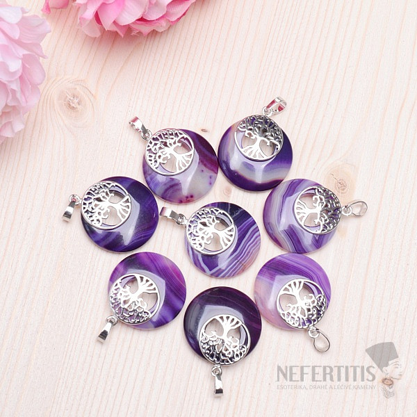Attractive pendant made of purple agate with the Tree of Life, with a handle made of base metal. The diameter of the stone is about 2.7 cm, the diameter of the tree of life is about 1.7 cm, the total length of the pendant, including the hanging eye, is about 3 cm, The tree of life is made of base metal. An unmissable and cute piece of jewelry that will enchant everyone. Illustrative depiction , individual pendants differ significantly from it, especially in color, structure and drawing of the stone.