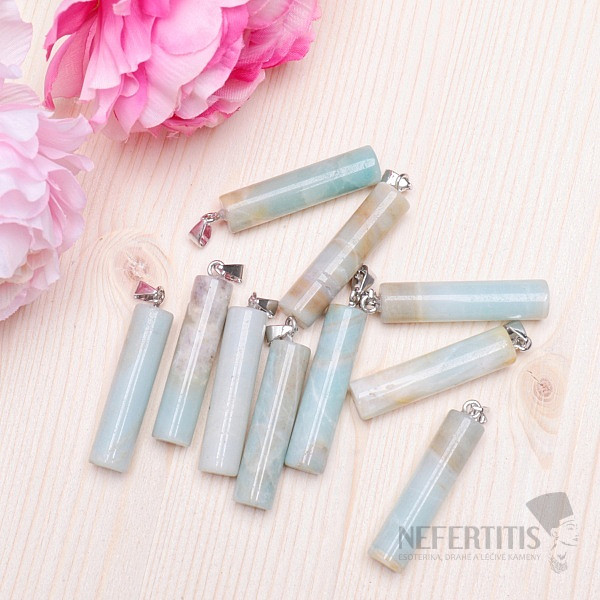 Attractive pendant made of amazonite in the shape of a roller, with a handle made of base metal. The diameter of the stone is about 1 cm, the size of the Amazon is about 4 cm, the total length of the pendant, including the hanging eye, is about 5 cm. Illustrative depiction , individual pendants differ significantly from him, especially in color, structure and drawing of the stone. The amazonite color range from blue, through green to brown, is typical.