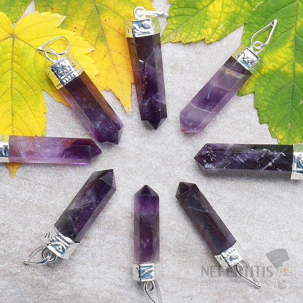 A beautiful pendant made of cut natural amethyst crystal traditionally calms fears, anger, worries and malice, increases hope, banishes guilt. The purple amethyst crystal is cut into a hexagonal obelisk, set in a silvery ornate galvanized metal mount, making it a distinctive, attractive and very elegant piece of jewelry. The size of the crystal is approx. 3 to 4 cm.