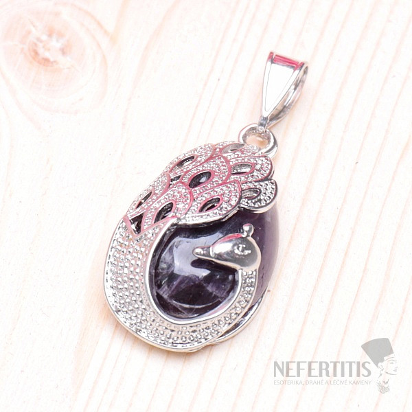 Attractive pendant made of amethyst decorated with a metal peacock, with a handle made of base metal. Pendant size approx. 3 cm and approx. 4.3 cm including hanging eyelets. Illustrative depiction , individual pendants can differ significantly from it, especially in color, structure and drawing of the stone.
