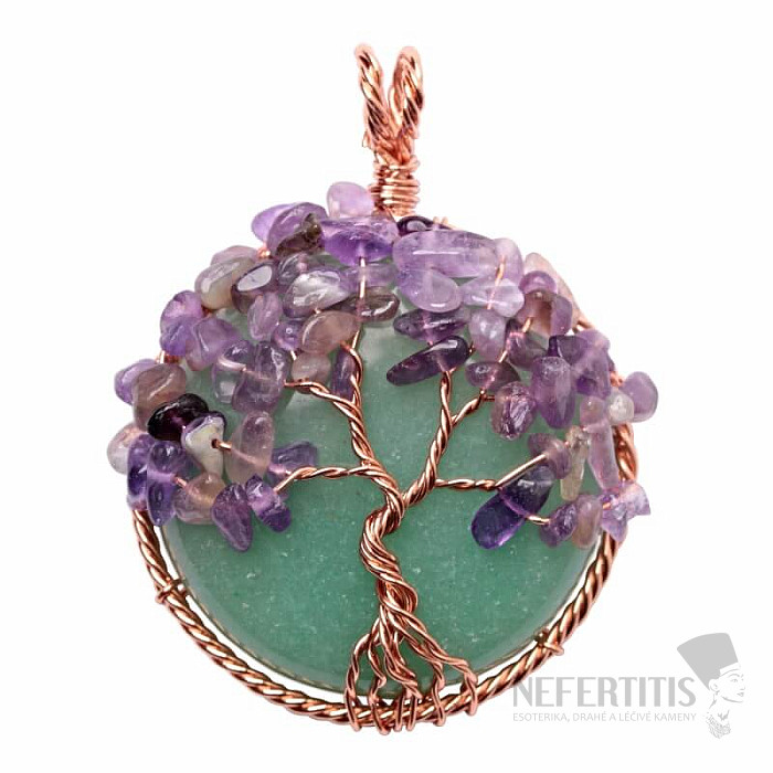 Attractive green aventurine pendant with amethyst Tree of Life. The diameter of the stone is approx. 4.5 cm, the total length of the pendant including the hanging eye is approx. 6.2 cm. The metal parts are made of base metal. An unmissable and cute piece of jewelry that will really charm everyone. Illustrative image , individual pendants differ from it mainly in the color shade, structure and drawing of the stone, but you will always receive a pendant of comparable quality.
