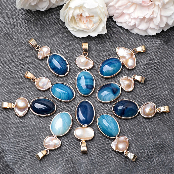 Attractive blue agate mother of pearl pendant with base metal clasp. A very elegant and lovely piece of jewelry. The length of the pendant is approx. 4 cm including hanging eyes, the size of the agate is approx. 1.9 cm, the metal parts are made of base metal. Illustrative image , individual pendants may differ from it mainly in color shade, structure and pattern of stone and mother of pearl.