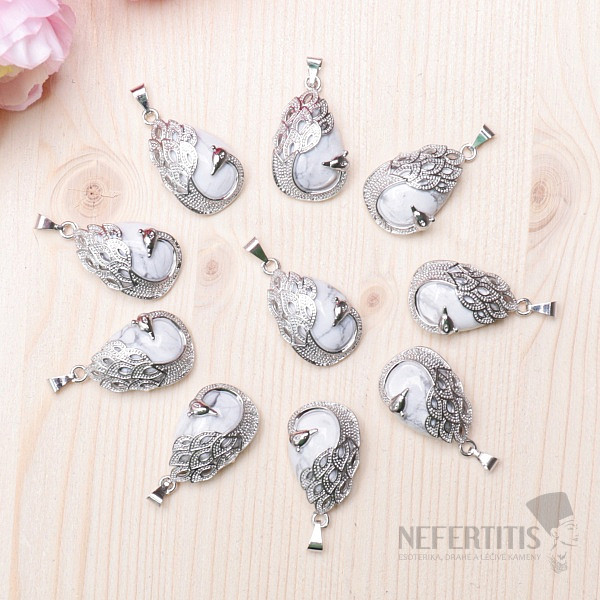 Attractive pendant made of white howlite decorated with a metal peacock, made of base metal, including a handle. Pendant size approx. 3 cm and approx. 4.3 cm including hanging eyelets. Illustrative depiction , individual pendants can differ significantly from it, especially in color, structure and drawing of the stone.