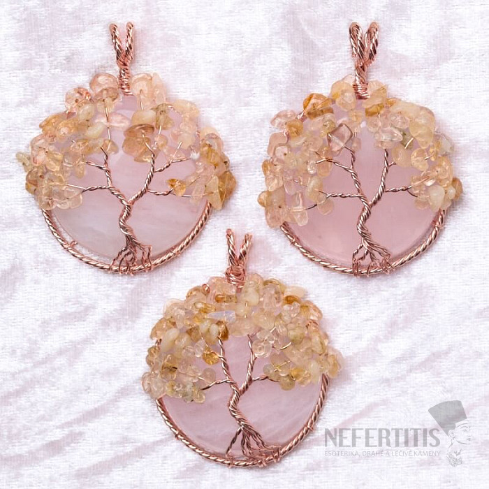 Attractive pendant made of rose quartz with the Tree of Life made of citrine. The diameter of the stone is approx. 4.5 cm, the total length of the pendant including the hanging eye is approx. 6.2 cm. The metal parts are made of base metal. An unmissable and cute piece of jewelry that will really charm everyone. Illustrative image , individual pendants differ from it mainly in the color shade, structure and drawing of the stone, but you will always receive a pendant of comparable quality.