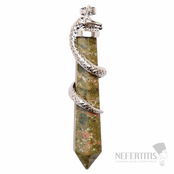 A beautiful unakite pendant in the shape of a crystal, wrapped around a snake. Unakit size approx. 4.8 cm, approx. 6.6 cm including hanging loop. The metal parts are made of base metal. Illustrative image , individual pendants may differ from it mainly in the structure, drawing and color shade of the stone.