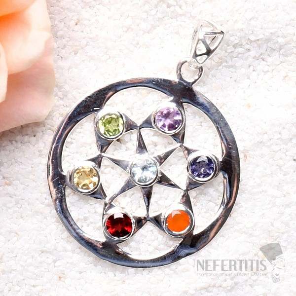 The handmade silver jewelry is set with 7 cut stones: red garnet, orange carnelian , yellow citrine, green olivine, blue topaz, blue-purple iolite and lavender-purple amethyst. In the Nefertitis collection of chakra jewelry, the precious stones are arranged by color in the way that the individual chakras follow each other in our body. From the Root to the Crown Chakra . Precious stones clean and charge individual chakras, and thanks to this, maximum harmonization of the entire energy system of your organism can be achieved. Chakra jewelry protects against stress.