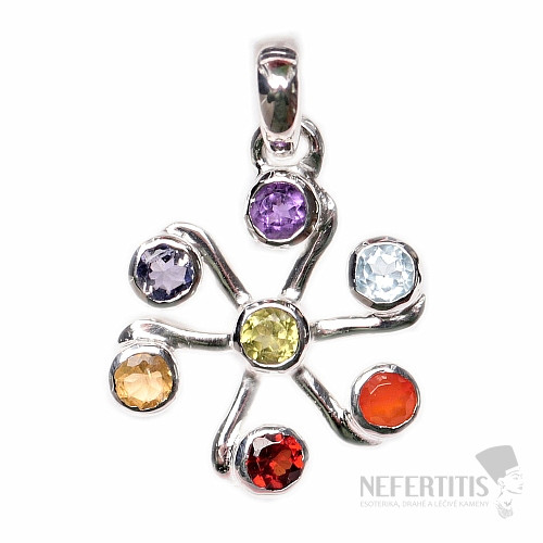 The handmade silver jewelry is set with 7 cut stones: red garnet, orange carnelian, yellow citrine, green olivine, blue topaz, blue-purple iolite and lavender-purple amethyst. In the Nefertitis collection of chakra jewelry, the precious stones are arranged by color in the way that the individual chakras follow each other in our body. From the Root to the Crown Chakra . Precious stones clean and charge individual chakras, and thanks to this, maximum harmonization of the entire energy system of your organism can be achieved.