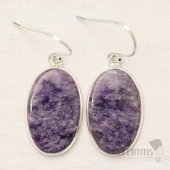 Distinctive silver earrings made of excellent quality charoite. Ag 925. The beautifully purple-colored charoite will enchant you not only with its silky shine, but also with the transformation of the pattern in the changing light. The stated weight is for the entire pair. You are purchasing the jewelry pictured directly.