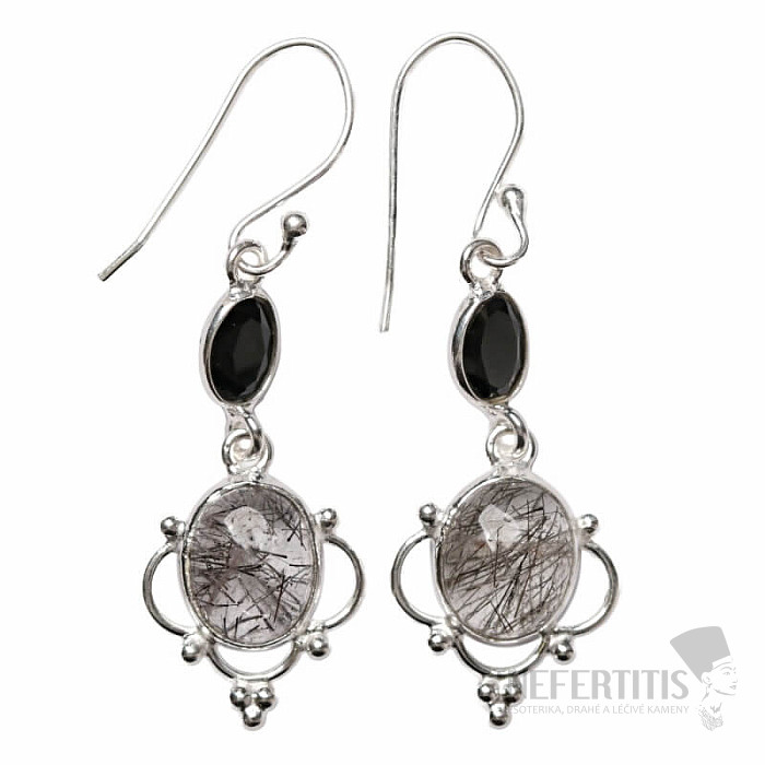 Attractive silver designer earrings made of crystal, with rich inclusions of black tourmaline - skoryl, and cut onyx. Ag 925. The unusual appearance of the stone due to inclusions resembling thin lines is combined into a designer piece of jewelry. The stated weight is for the entire pair. You are purchasing the jewelry shown directly.