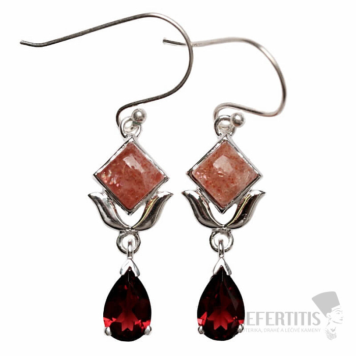 Attractive silver designer earrings with sunstones and cut garnets. Ag 925. The weight listed is for the entire pair. You are purchasing the exact pair shown. Sunstone is said to bring joy and light into life. Folk… more »