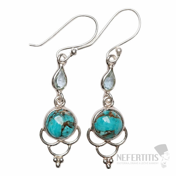 Attractive silver designer earrings with pieces of turquoise connected by copper into impressive turquoise blue cabochons. This type of jewelry is gaining great popularity worldwide due to the ever-increasing price of solid pieces of natural turquoise. Turquoise in jewelry brings luck and supports love. Copper has been used as a powerful healing agent in many cultures around the world since time immemorial. The first mention of the healing effects of copper is on an Egyptian papyrus from the period 2600 to 2200 BC. Ag 925. Turquoise is complemented by cut topaz. The stated weight is for the entire pair. You are purchasing the jewelry pictured directly.